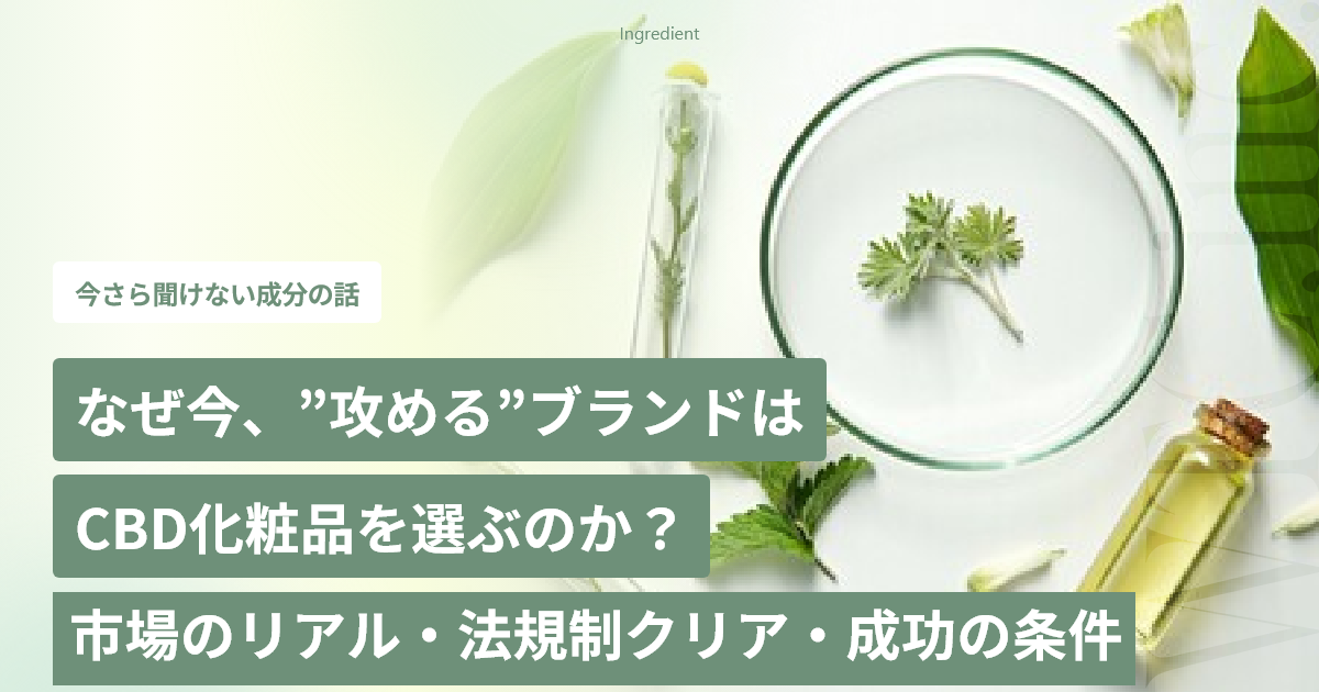 北米などでの法規制緩和を機に、CBDはストレスケアや健康維持に関心が高い層を中心に、オイルやサプリメントで人気が爆発。その流れが美容分野にも波及し、「クリーンビューティー」「ナチュラルコスメ」のトレンドと合流しました。